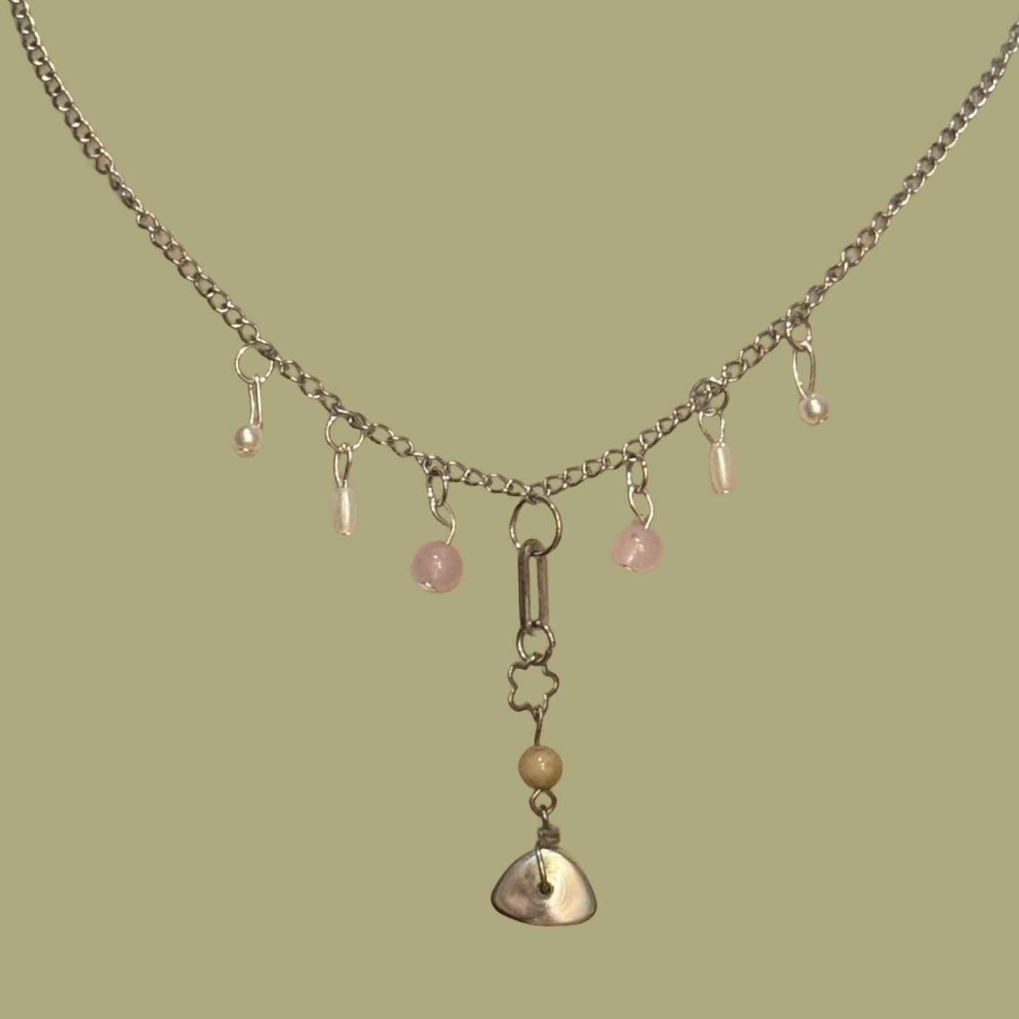 16-inch necklace made with recycled parts, plastic beads, and stainless steel.