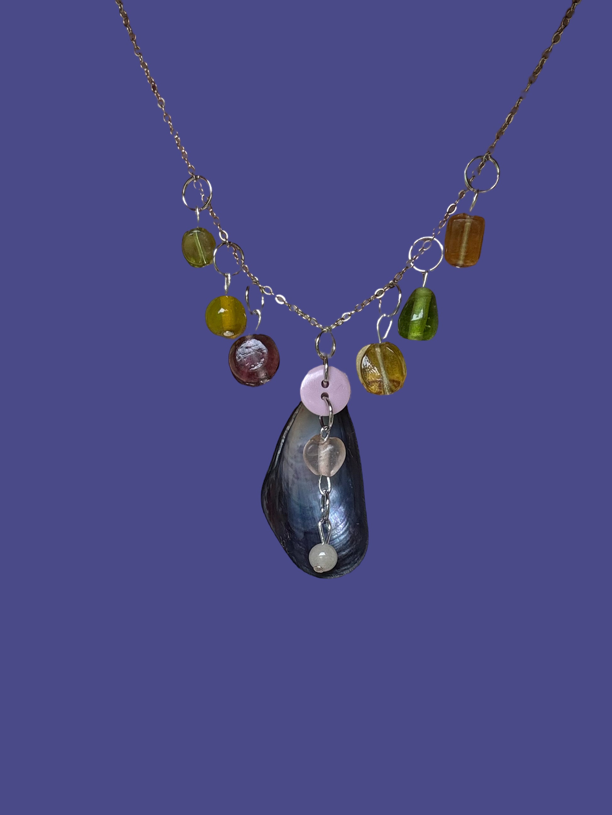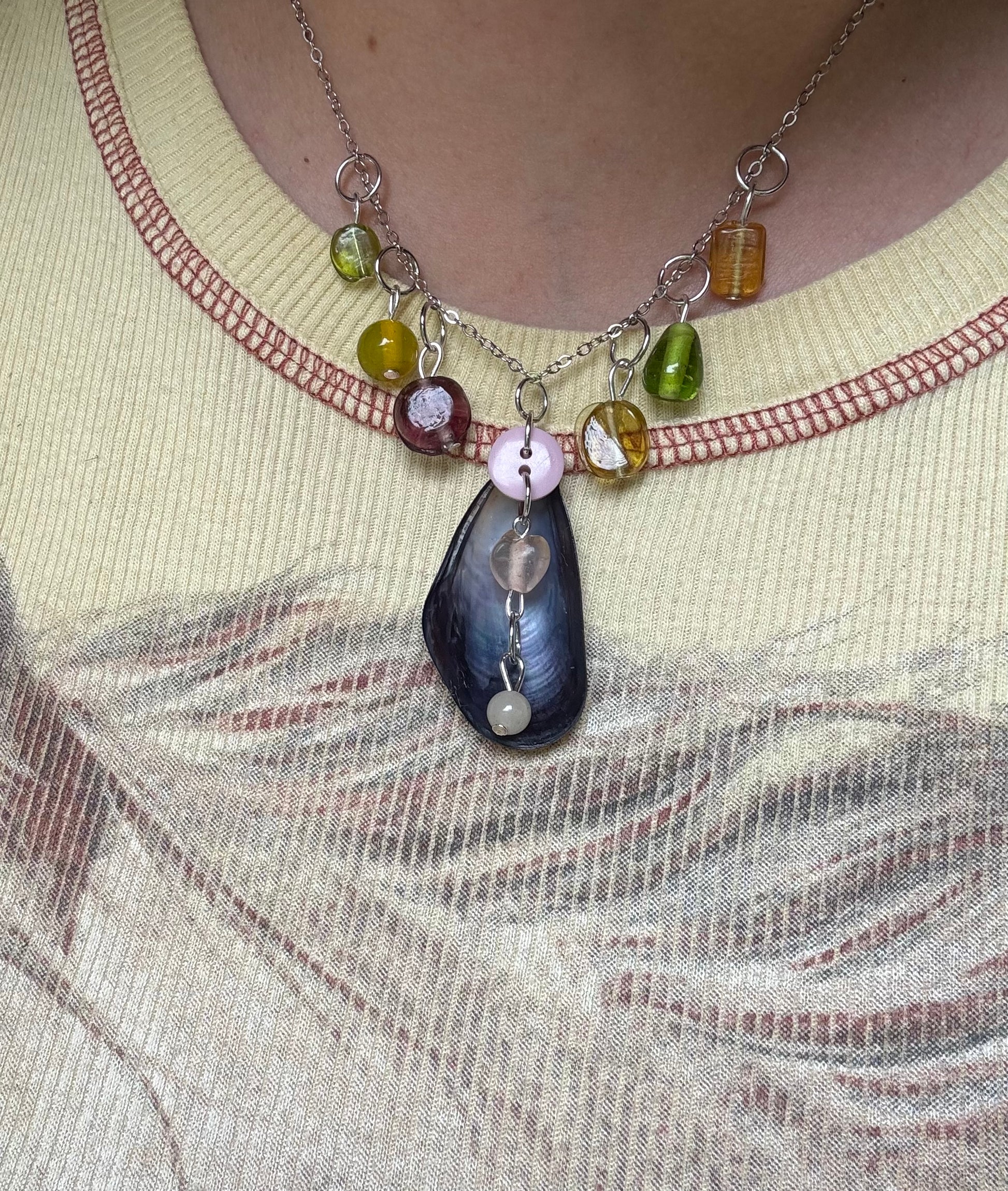 Mussel dangling pendant with button and glass blown bead charms. Pendant is 2-inches in length and total length is 16-inches on a silver gold-plated chain.